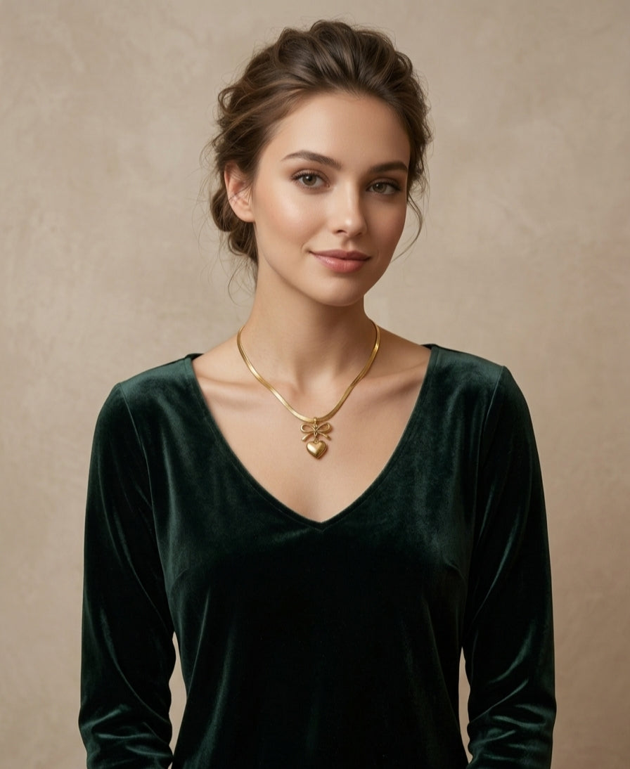 Apne outfit ko ek naye aur khoobsurat andaaz mein style karein! Hamara yeh Classic Bow & Heart Necklace un sabhi ke liye perfect hai jo elegant aur minimal accessories pasand karte hain.